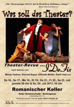 IDeFix ist wieder da! Zwölf Monate nach den gefeierten Aufführungen der Theaterrevue „Raus mit der Sprache!“ bringt die internationale und preisgekrönte Theatergruppe der Universität Heidelberg ihr neues Programm auf die Bühne. Es ist wieder eine Theaterrevue mit Minidramen: Was soll das Theater? lautet das Motto für Szenen nach Monty Python, Loriot, Botho Strauß, Helmut Qualtinger, William Shakespeare & Keith Hall. Ein Theaterabend über die uralte Leidenschaft, Theater zu spielen und Theater zu schauen, über Menschen, die diese Leidenschaft immer wieder zusammenführt: An der Theaterkasse stehen die Leute Schlange. In Vorfreude auf das künstlerische Ereignis und inmitten von Gleichgesinnten erreicht der Kampf um die Plätze schnell dramatische Dimensionen. Währenddessen wird auf der Bühne noch geprobt, und einige der talentiertesten Regisseure des zeitgenössischen Theaters zeigen, wer die Theatergötter von heute sind. Ein hoffnungsvoller Jungschauspieler entscheidet sich dennoch für den „schönsten Beruf in der Welt“, muss aber noch das Vorsprechen überstehen. Am Ende ihrer Karriere angelangt sind bereits zwei Mimen, die in ihrer Garderobe sitzend ihren großen Erfolgen nachtrauern, die sie nie hatten. Die Schauspieler auf der Bühne bekommen derweil Unterstützung von ihren begabten Zuschauern, die gerne und ohne Gage mitspielen. Ihre Rolle in dem Spiel haben auch zwei Theaterkritikerinnen, die sich nicht verkneifen können, sofort und vor aller Ohren ihre Kommentare loszuwerden. Eingeladen zu IDeFix‘ Theatertreffen ist auch Shakespeares Zettel, der des Menschen „unwiderstehliche Lust, sich im Spiel von einer Gestalt in die andere, von einem Schicksal ins andere, von einem Affekt in den anderen zu stürzen“ wohl am schönsten verkörpert. Zusammen mit seinen Freunden unterhält er diesmal nicht eine Hochzeitsgesellschaft, sondern spielt zum 625. Geburtstag der Universität Heidelberg. Was das Theater soll? Eine Antwort sei vorab schon gegeben. Sie stammt von Goethe: „Da ist Poesie, da ist Malerei, da ist Gesang und Musik, da ist Schauspielkunst und was nicht noch alles. Wenn alle diese Künste und Reize von Jugend und Schönheit an einem einzigen Abend zusammenwirken, so gibt es ein Fest, das mit keinem anderen zu vergleichen ist.“ Heidelberg, im Juli 2011 |